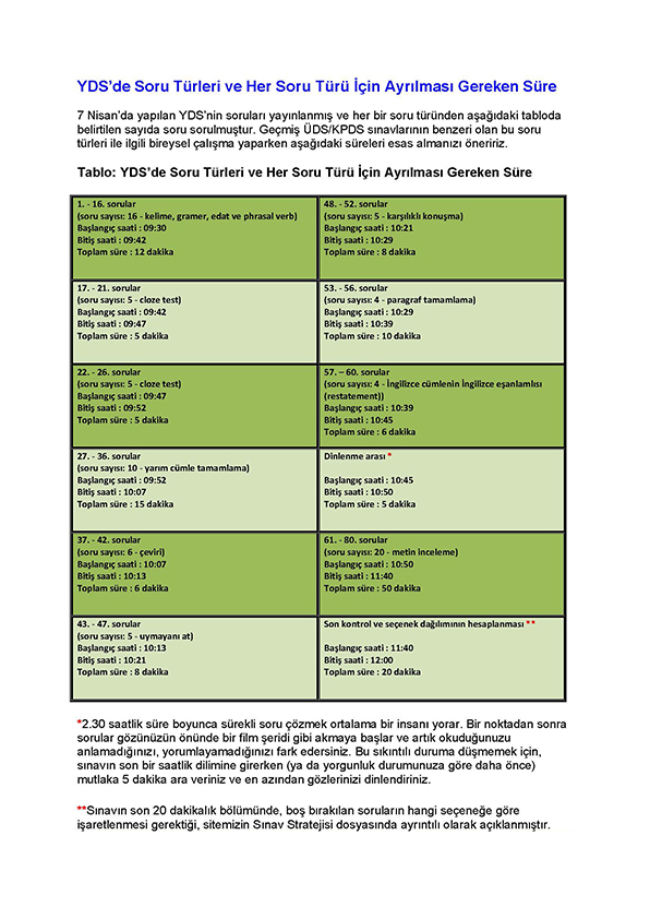 1. Önerilen sürelerin hangi kriterler dikkate alınarak belirlendiğini öğrenmek isterseniz, sitemizdeki YDS’de Süre Yönetimi ve Sınav Stratejisi adlı dosyaları dikkatle inceleyiniz.